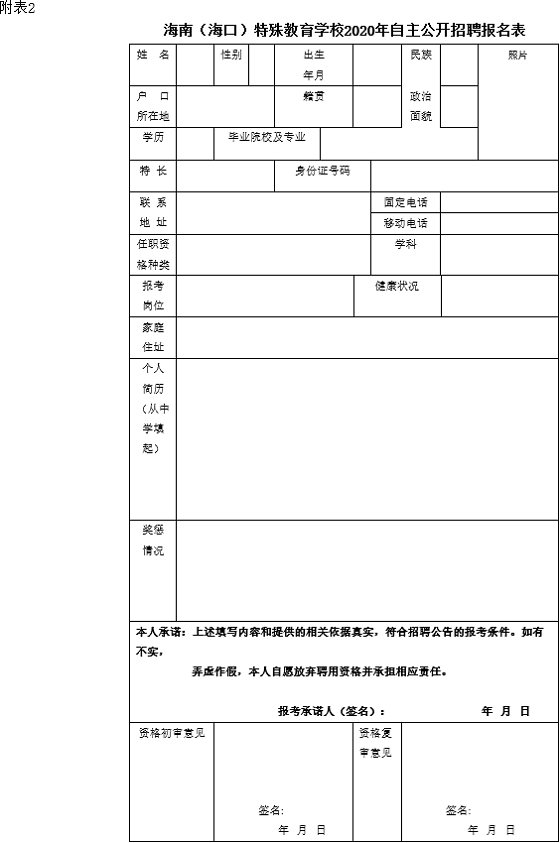 2、海南(?冢┨厥饨逃龑W(xué)校2020年自主公開招聘報(bào)名表