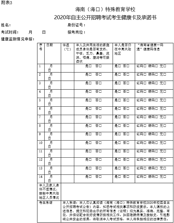 3、海南(海口)特殊教育學(xué)校2020年自主公開招聘考試考生健康卡及承諾書