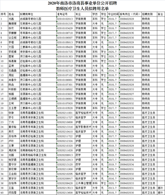 附:2020年商洛市洛南縣、鎮(zhèn)安縣事業(yè)單公開招聘擬聘用人員名單