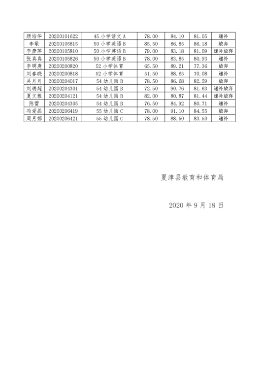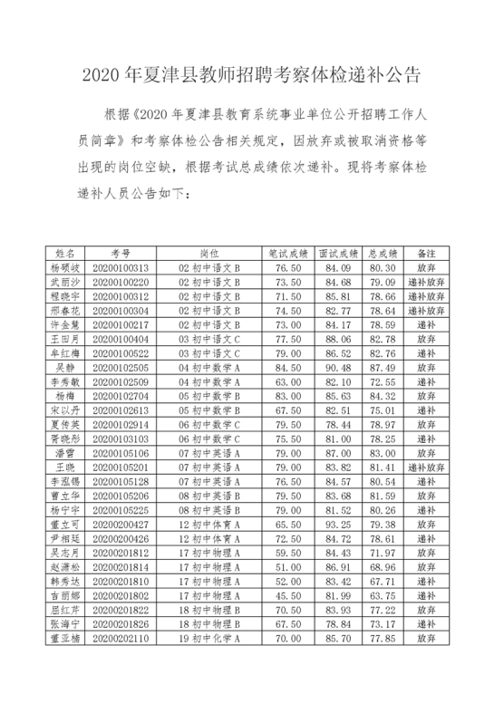 山東德州市夏津縣2020年教師招聘考察體檢遞補(bǔ)公告