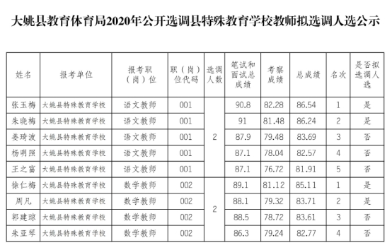 云南楚雄州大姚縣教育體育局2020年公開選調(diào)縣特殊教育學(xué)校教師擬選調(diào)人選公示