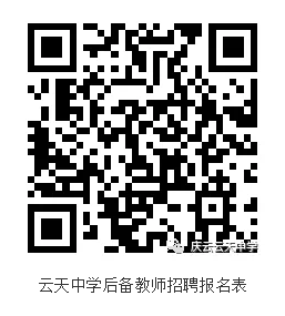 2.報名方式:報名采取網(wǎng)上報名方式。掃描下方二維碼下載《云天中學(xué)教師招聘報名登記表》,填寫個人信息(兩個表格都要填寫)并以電子郵件添加附件的方式發(fā)送至慶云云天中學(xué)校長郵箱(qyytzxxzxx@163.com),郵件主題和報名表注明“報考學(xué)科:×××,姓名:×××”,例如:“語文張三”。