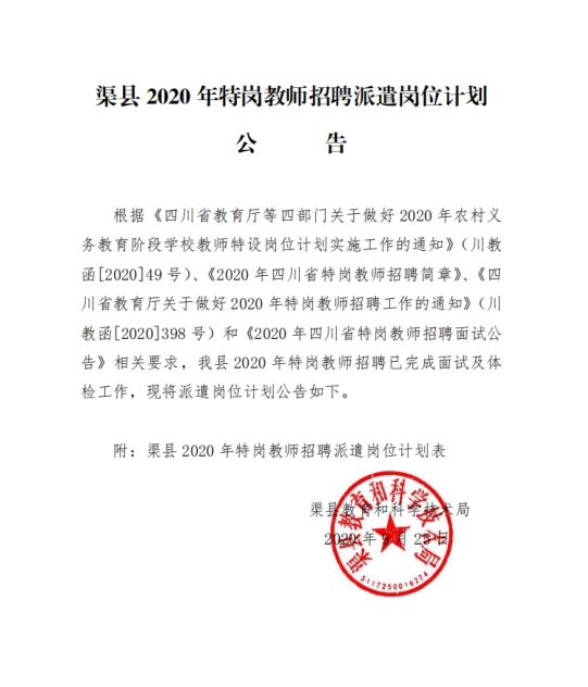 四川達(dá)州渠縣2020年特崗教師招聘派遣崗位計(jì)劃公告