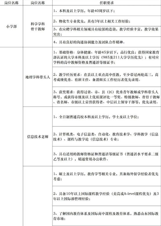 小學、初中、高中各學科教師(語文、數(shù)學、英語、物理、化學、地理、歷史、政治、生物、體育、音樂、美術(shù)、戲劇、科學、信息技術(shù))常年儲備性招聘。