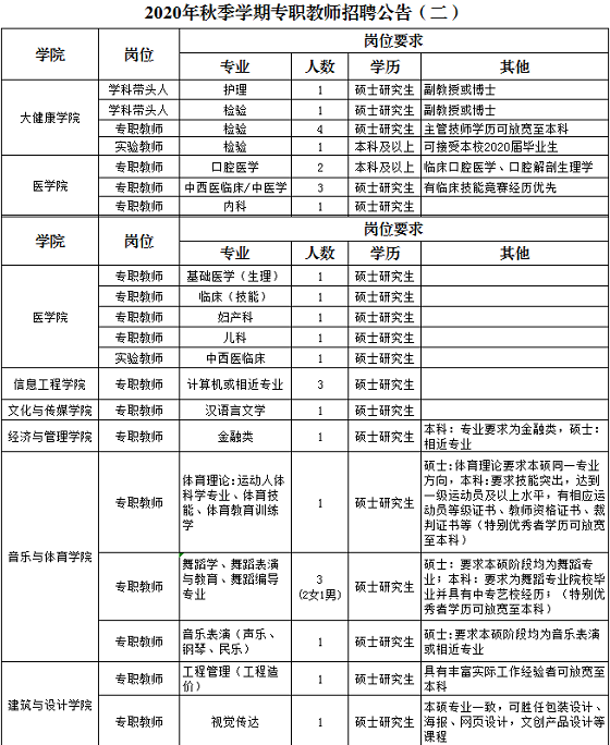3.具備應聘專業(yè)的行業(yè)領域內(nèi)中級職稱或執(zhí)業(yè)資格的雙師型教師可放寬學歷條件,如:工程造價專業(yè)教師具有工程項目中級職稱者,舞蹈學專業(yè)教師具有中專藝校經(jīng)驗者。