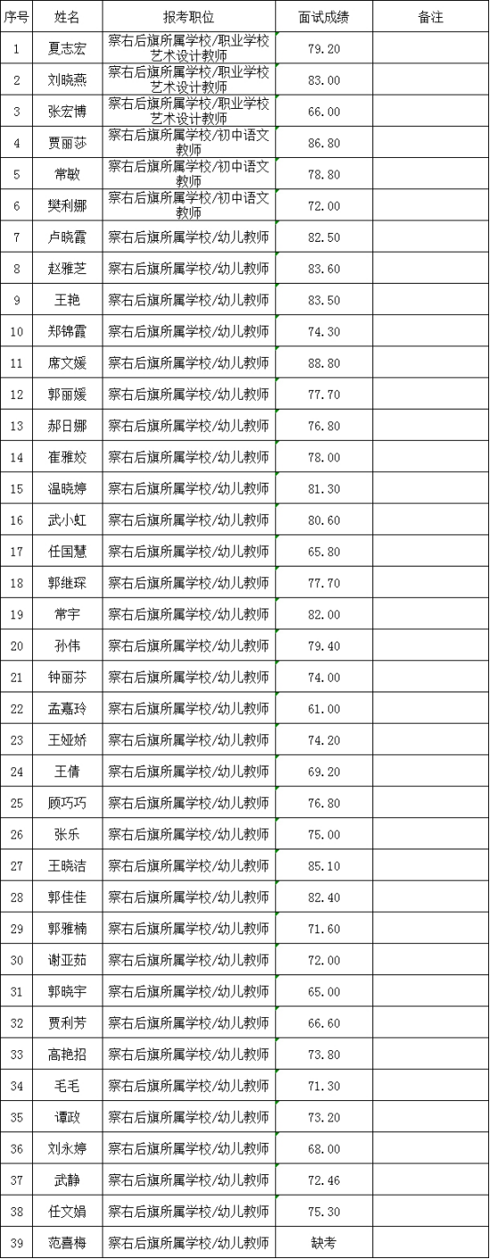 內(nèi)蒙古烏蘭察布市察右后旗2020年普通崗位教師面試成績(jī)