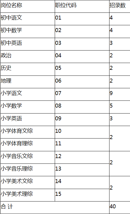 本次共招錄初中教師17名,其中語文、數(shù)學(xué)各4名,英語3名,政治、歷史、地理各2名。小學(xué)教師23名,其中語文9名,數(shù)學(xué)5名,英語3名,體育、音樂、美術(shù)各2名。