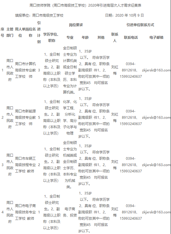 附件:周口技師學(xué)院(周口市高級(jí)技工學(xué)校)2020年引進(jìn)高層次人才需求征集表