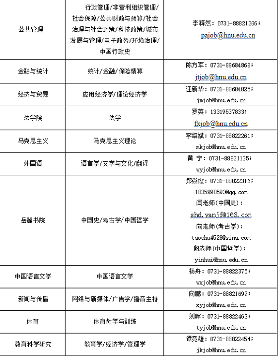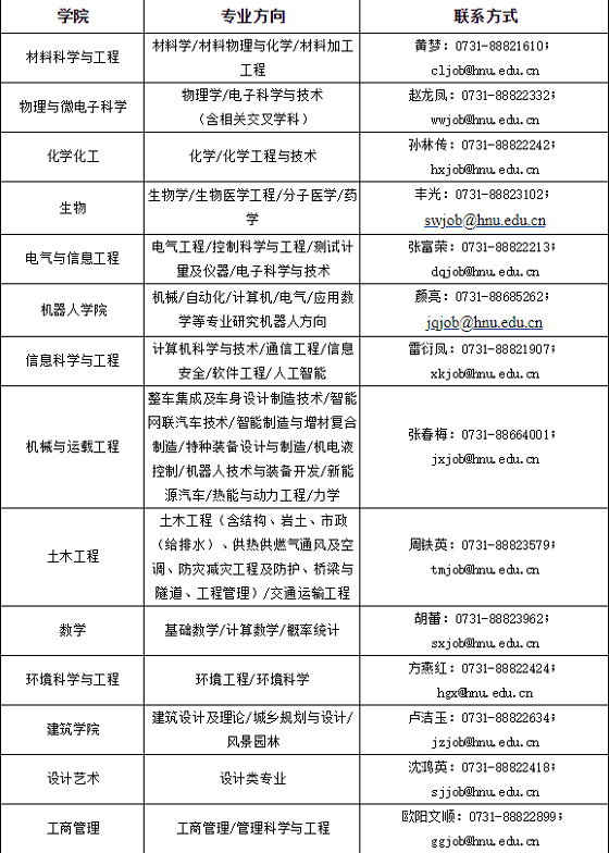 請將涵蓋本人基本信息和業(yè)績的簡歷通過電子郵件發(fā)送至招聘崗位所在學院郵箱(見后表)并抄送至人力資源處(job@hnu.edu.cn)。