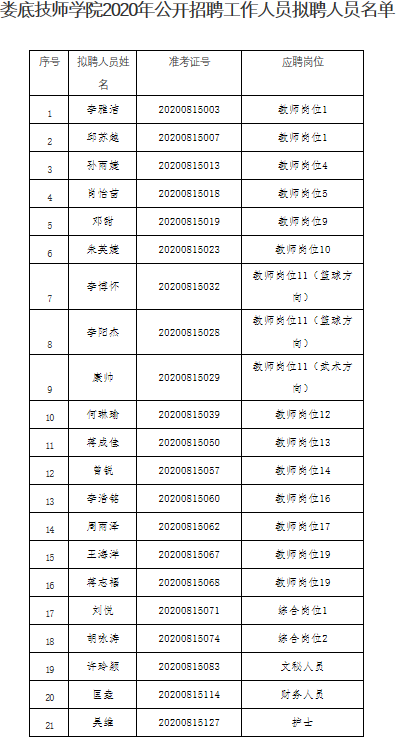 附件:婁底技師學院2020年公開招聘工作人員擬聘人員名單
