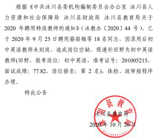 2020年四川樂山市沐川縣教育局特崗教師招聘遞補公告