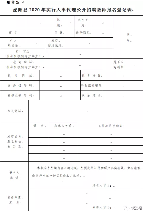 2.《泌陽縣2020年實行人事代理公開招聘教師報名登記表》
