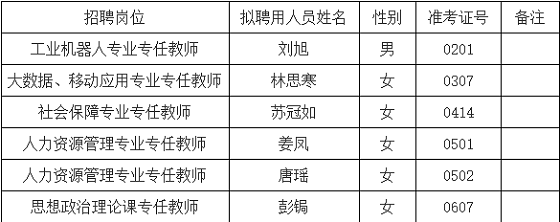 根據(jù)《湖南勞動人事職業(yè)學(xué)院2020年公開招聘公告》及有關(guān)規(guī)定,經(jīng)報名、資格審查、面試、試講、體檢、考察等程序,經(jīng)學(xué)院黨委會研究,確定劉旭等6名同志為2020年湖南勞動人事職業(yè)學(xué)院公開招聘擬聘用人選,現(xiàn)予以公示。