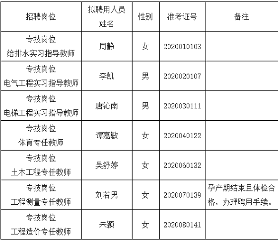 根據(jù)《湖南建筑高級技工學校2020年公開招聘公告》及有關(guān)規(guī)定,經(jīng)報名、資格審查、筆試、試講、體檢、考察等程序,經(jīng)學校會議研究,確定周靜等7名同志為2020年我校公開招聘擬聘用人選,現(xiàn)予以公示。
