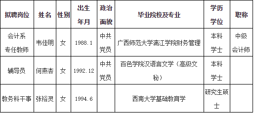 根據(jù)《關(guān)于印發(fā)<廣西壯族自治區(qū)事業(yè)單位公開招聘人員實(shí)施辦法>的通知》(桂人社發(fā)[2011]155號(hào))及《廣西金融職業(yè)技術(shù)學(xué)院2020年第一批公開招聘非實(shí)名人員控制數(shù)工作人員公告》的有關(guān)規(guī)定,通過報(bào)名、資格審查、考試、考核、體檢等程序,經(jīng)研究決定,擬聘韋佳明、何燕杏、張?jiān)l`同志為我院工作人員。現(xiàn)將擬聘用人員名單予以公示,公示時(shí)間為2020年10月29日-2020年11月6日,如有異議,請于11月6日下午5:00前以書面形式并署真實(shí)姓名反饋到學(xué)院紀(jì)委或組織人事處。聯(lián)系地址:廣西南寧市大學(xué)西路168號(hào),郵政編碼:530007,聯(lián)系電話:0771—3481676,0771—3481779。