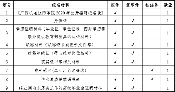 應(yīng)聘者按照招聘崗位具體要求對(duì)口報(bào)名,每名應(yīng)聘者限報(bào)一個(gè)崗位,采用現(xiàn)場(chǎng)報(bào)名遞交應(yīng)聘材料的方式報(bào)名。報(bào)名人員須下載并填寫(xiě)《廣西機(jī)電技師學(xué)院2020年公開(kāi)招聘報(bào)名表》(附表2)