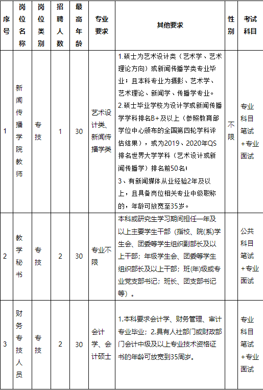 閩江學院2020年公開招聘碩士研究生崗位信息表