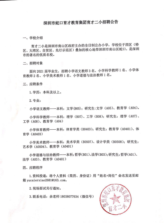 2021年深圳市蛇口區(qū)育才教育集團(tuán)育才二小招聘教師公告【8人】