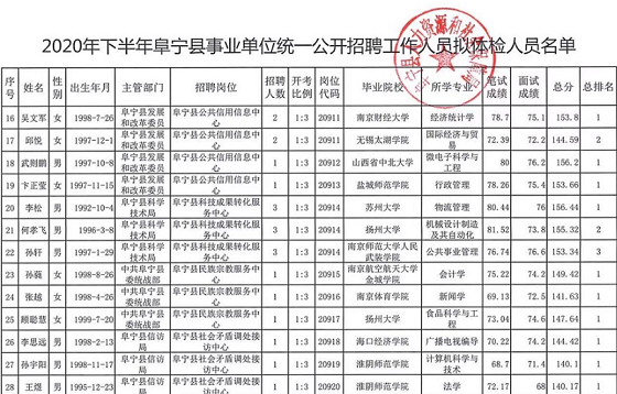 2020年下半年鹽城阜寧縣事業(yè)單位統(tǒng)一公開(kāi)招聘工作人員擬體檢人員名單公布