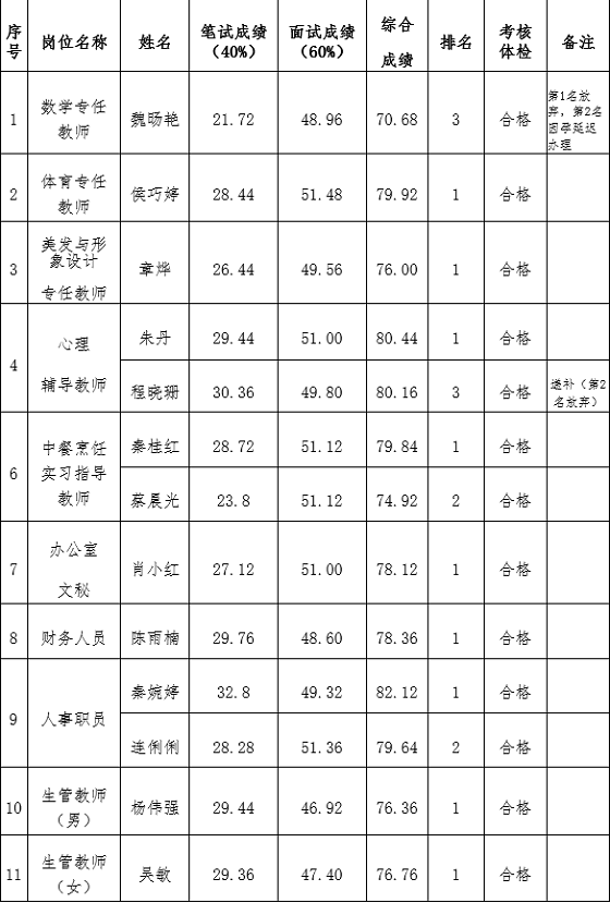 1.序號1數(shù)學(xué)專任教師崗位擬招聘3人,僅3人參加面試,第1名考生自動放棄,無可遞補人選;第2名考生因孕延遲辦理。