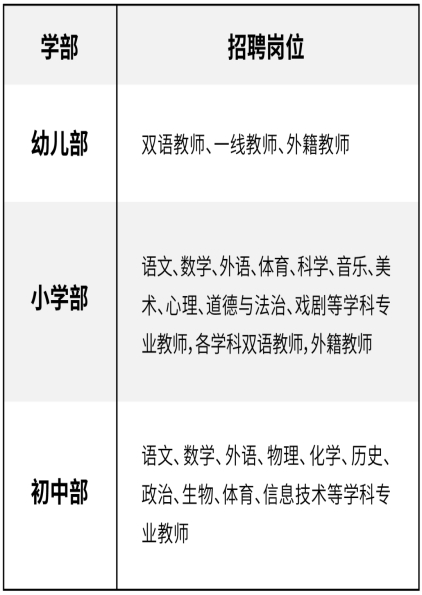 雙語教師崗位需具備學(xué)科中英文雙語教學(xué)能力,有海外留學(xué)、教學(xué)經(jīng)歷或國際學(xué)校工作經(jīng)驗者優(yōu)先。
