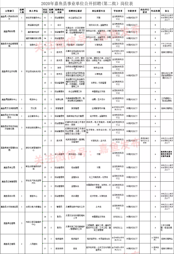 附件1:2020年嘉魚縣事業(yè)單位公開招聘(第二批)崗位表