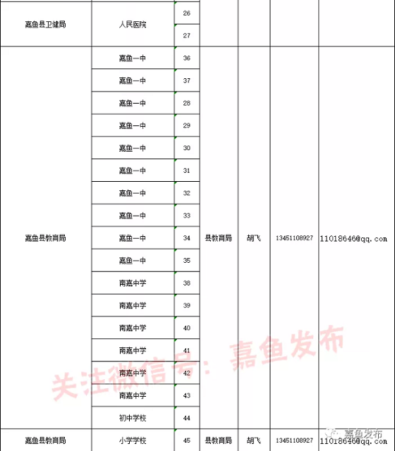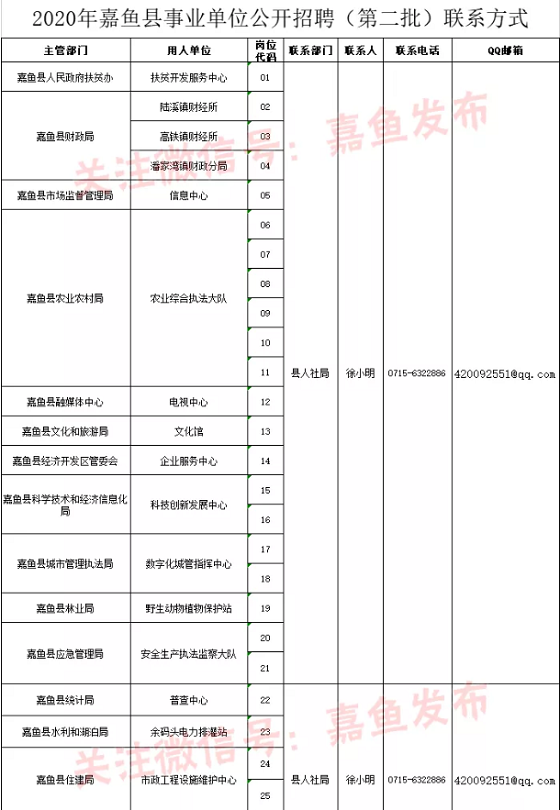 附件2:2020年嘉魚縣事業(yè)單位公開招聘(第二批)聯(lián)系方式