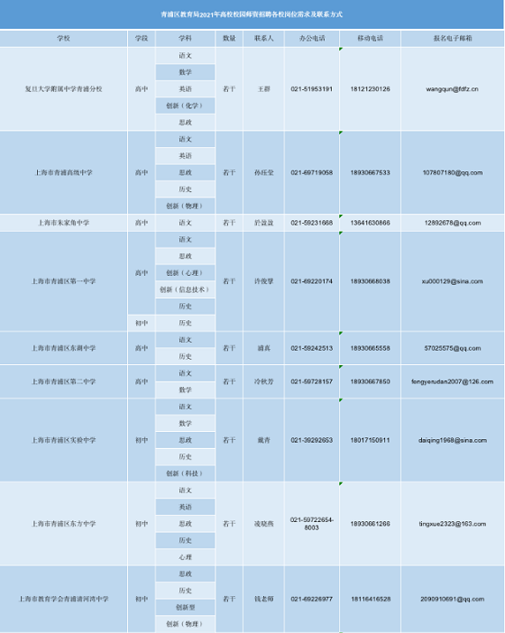 詳見《青浦區(qū)教育局2021年高校校園師資招聘各校崗位需求及聯(lián)系方式》一覽表。
