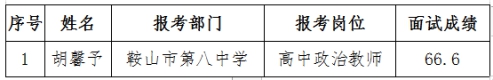 報考鞍山市第八中學政治教師崗位的考生黃祿迪主動放棄簽約資格。根據(jù)《鞍山市教育局2021屆校園招聘公告》有關規(guī)定,同崗位面試第二名的考生胡馨予依次遞補。