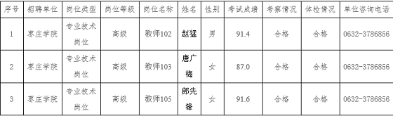 根據(jù)《關(guān)于2020年省屬事業(yè)單位公開招聘工作人員有關(guān)問題的通知》(魯人社發(fā)〔2019〕40號(hào))等相關(guān)規(guī)定,按照崗位招聘計(jì)劃,棗莊學(xué)院組織完成了公開招聘考試、考察、體檢等工作,現(xiàn)對(duì)棗莊學(xué)院擬聘用人員進(jìn)行公示。公示期為7個(gè)工作日,自2020年11月26日至2020年12月4日(不含節(jié)假日)。公示期間,如對(duì)公示人選有異議,請(qǐng)及時(shí)向省事業(yè)單位公開招聘主管機(jī)關(guān)和棗莊學(xué)院反映。