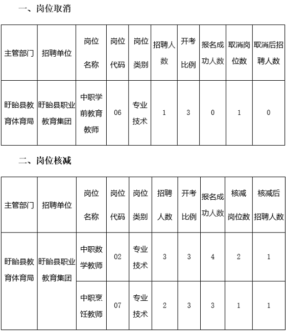 2020年盱眙縣職業(yè)教育集團公開招聘教師報名工作已結(jié)束。因部分崗位(詳見下表)符合報名條件人數(shù)未達到《2020年盱眙縣職業(yè)教育集團公開招聘教師公告》規(guī)定的開考比例,現(xiàn)根據(jù)《2020年盱眙縣職業(yè)教育集團公開招聘教師公告》的規(guī)定,現(xiàn)將取消和核減的崗位公告如下: