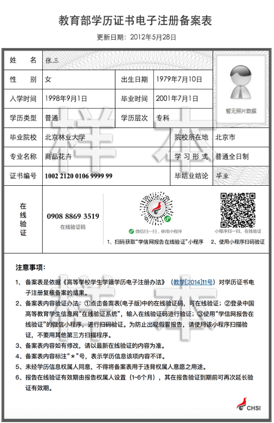 3.學(xué)信網(wǎng)學(xué)歷證書電子注冊(cè)備案表打印件樣張;