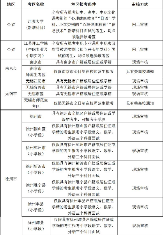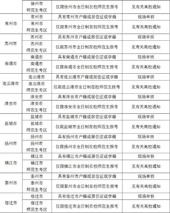 4.江蘇省內(nèi)就讀的全日制在校本?茙煼渡腿罩平逃T士選擇院校所在地的師范生考區(qū)為應(yīng)試考區(qū)。全省報(bào)考中職專業(yè)課和中職實(shí)習(xí)指導(dǎo)教師面試的考生(含師范生)統(tǒng)一選則江蘇理工學(xué)院考區(qū),全省報(bào)考新增科目面試的考生(含師范生)統(tǒng)一選擇江蘇大學(xué)考區(qū)。