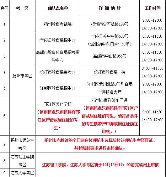 其他類別考生現(xiàn)場審核時間: 2020年12月13日~15日17:00(揚州市區(qū)上午9:00~12:00,下午14:00~17:00);