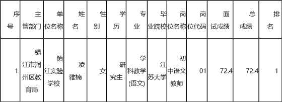根據(jù)《2019年下半年江蘇省鎮(zhèn)江市潤州區(qū)教育系統(tǒng)赴高校公開招聘教師公告》(鎮(zhèn)潤人社事招公告〔2019〕6號)規(guī)定,以下一名同志因懷孕暫緩錄用,經(jīng)考試、體檢、政審(考察)合格,符合錄用條件,現(xiàn)予公示,公示時間2020年12月8日至12月16日。監(jiān)督電話:0511-81988369;政策咨詢電話:0511-85589160。擬錄用名單公示如下: