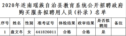 歡迎加入廣東教師考編群,群號:336260161,考情、招聘信息早知道!2020年連南瑤族自治縣教育系統(tǒng)公開招聘政府購買服務(wù)人員筆試、面試、體檢和考察等程序已進(jìn)行完畢。根據(jù)《2020年連南瑤族自治縣教育系統(tǒng)公開招聘政府購買服務(wù)人員的公告》要求,現(xiàn)將擬聘用人員(補(bǔ)錄)名單予以公示(詳見附表)。