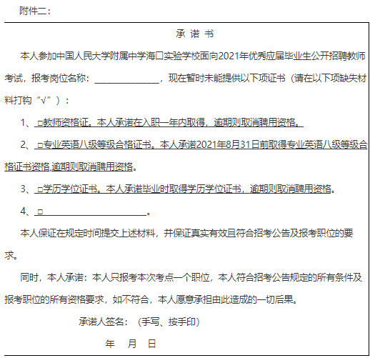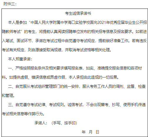 未發(fā)放三方就業(yè)協(xié)議書或需網(wǎng)上邀約的入圍考生,也須按規(guī)定時間按要求簽署承諾書。承諾三方協(xié)議發(fā)放之日起3日內(nèi)(以協(xié)議寄出的時間為準)將本人簽名的就業(yè)協(xié)議書和就業(yè)協(xié)議書發(fā)放證明(內(nèi)容須含三方協(xié)議發(fā)放時間,加蓋“就業(yè)指導(dǎo)中心公章”或院系公章)寄送到我校。網(wǎng)上簽約院校的入圍考生,須承諾在應(yīng)約通知之日起三日內(nèi)完成簽約。逾期沒有完成上述要求的,我校有權(quán)取消其聘用資格。