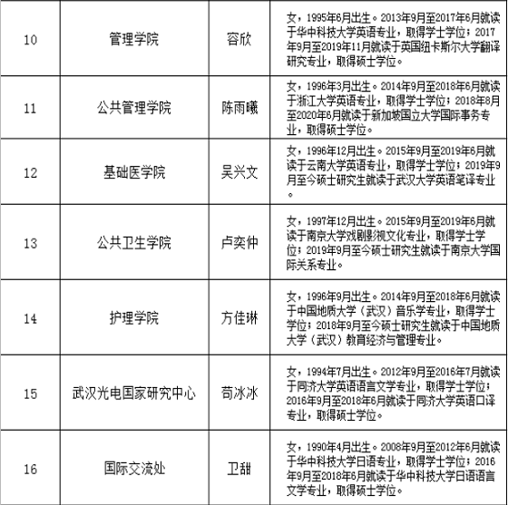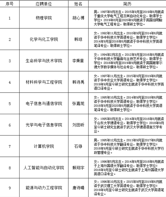 根據(jù)華中科技大學(xué)2020年度公開招聘外事秘書(外事專員)啟事,經(jīng)個(gè)人報(bào)名、資格審查、筆試、面試和用人單位考察等程序,確定胡心博等16人為擬招人選,現(xiàn)予以公示。公示期間,如對(duì)公示對(duì)象有異議,請(qǐng)向我單位反映。