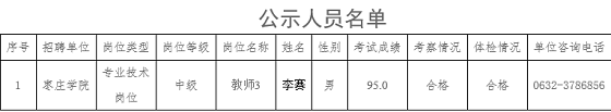 根據(jù)《關(guān)于2020年省屬事業(yè)單位公開招聘工作人員有關(guān)問題的通知》(魯人社發(fā)〔2019〕40號)等相關(guān)規(guī)定,按照崗位招聘計(jì)劃,棗莊學(xué)院組織完成了公開招聘考試、考察、體檢等工作,現(xiàn)對棗莊學(xué)院擬聘用人員進(jìn)行公示。公示期為7個工作日,自2020年12月17日至2020年12月25日(不含節(jié)假日)。公示期間,如對公示人選有異議,請及時向省事業(yè)單位公開招聘主管機(jī)關(guān)和棗莊學(xué)院反映。