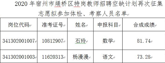 根據(jù)《安徽省2020年特崗教師招聘空缺計(jì)劃再次征集志愿公告》,現(xiàn)將宿州市埇橋區(qū)2020年特崗教師招聘空缺計(jì)劃再次征集志愿體檢、考察有關(guān)事宜通知如下: