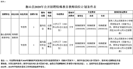 1.衡山縣2020年公開(kāi)招聘特殊教育教師崗位計(jì)劃條件表