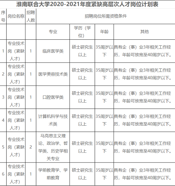 為加快技能型高水平大學(xué)建設(shè),構(gòu)建科學(xué)合理的師資隊伍,貫徹落實《國家職業(yè)教育改革實施方案》,根據(jù)《事業(yè)單位人事管理條例》(國務(wù)院令第652號)、《關(guān)于印發(fā)〈安徽省事業(yè)單位公開招聘人員暫行辦法〉的通知》(皖人社發(fā)〔2010〕78號)等文件規(guī)定和要求,經(jīng)上級主管部門批準,淮南聯(lián)合大學(xué)組織實施2020-2021年招聘緊缺高層次人才工作,F(xiàn)將有關(guān)事項公告如下: