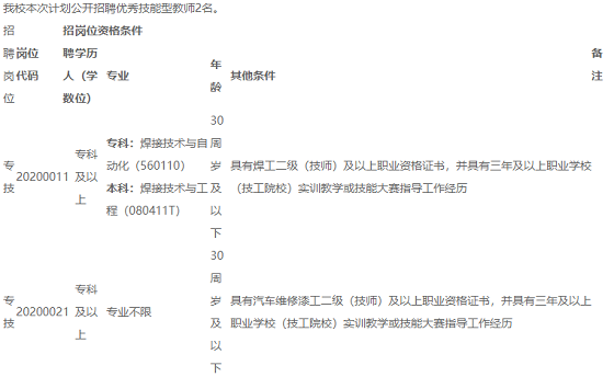招聘優(yōu)秀技能型教師須為國家承認(rèn)學(xué)歷的大學(xué)?萍耙陨袭厴I(yè)生,并具備以下條件: