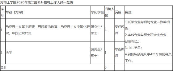 河南工學院2020年第二批公開招聘工作人員一覽表