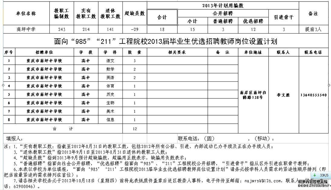 重慶市南坪中學(xué)2013年教師招聘計(jì)劃