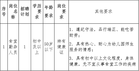 因幼兒園教學(xué)及日常需求,經(jīng)研究確定,我幼兒園擬招聘2名幼兒教師及1名食堂勤雜人員,F(xiàn)將有關(guān)事項公告如下: