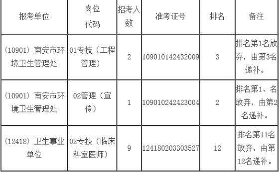 根據(jù)招考公告,考生在資格復審、體檢等環(huán)節(jié)因不合格或棄權(quán)等原因造成崗位空缺的,在該崗位符合條件的其他考生中按綜合成績從高到低的順序依次等額遞補,第三批遞補人員具體名單如下: