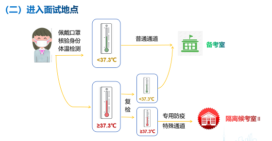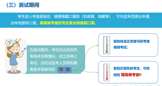 3.在考點入口,發(fā)現(xiàn)考生發(fā)熱(體溫≥37.3℃)等身體異常癥狀時,考生應(yīng)主動配合考點工作人員詢問、復(fù)檢。復(fù)檢體溫正常的,可進(jìn)入考場參加筆試。復(fù)檢仍發(fā)熱的,根據(jù)綜合研判具備正常參加考試條件的,將安排在備用隔離考室。
