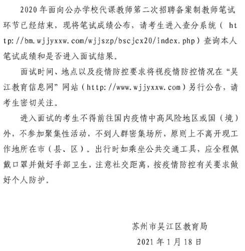 2020年江蘇省蘇州市吳江區(qū)面向公辦學(xué)校代課教師第二次招聘備案制教師筆試成績公告