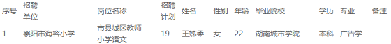 根據(jù)《2020年湖北省襄陽市襄城區(qū)義務教育學校教師統(tǒng)一招聘考試公告》的有關規(guī)定,經(jīng)過筆試、面試、體檢、考察等環(huán)節(jié),確定王姊柔同志為2020年度襄城區(qū)義務教育教師統(tǒng)一公開招聘第二批擬聘用人員,現(xiàn)面向社會進行公示,公示期七個工作日,自2021年1月20日至2021年1月28日止。
